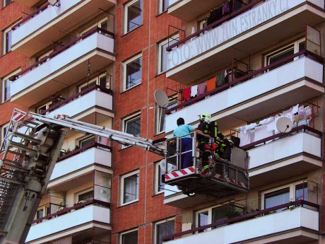 Požár prvního segmentového domu na Jižních svazích ve Zlíně ve čtvrtek 8. července 2010 - oheň viditelný zvenku od 8:30 hod. SELČ, hasiči přijíždějí v 8:45 hod. SELČ a hašení + evakuace začíná v 8:49 hod. SELČ.
