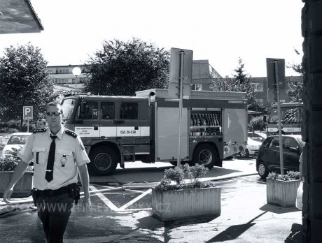 Týl akce za prvním segmetem. Požár prvního segmentového domu na Jižních svazích ve Zlíně ve čtvrtek 8. července 2010 - oheň viditelný zvenku od 8:30 hod. SELČ, hasiči přijíždějí v 8:45 hod. SELČ a hašení + evakuace začíná v 8:49 hod. SELČ.