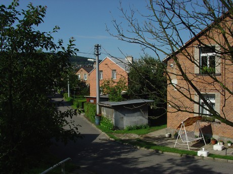 Hranice výstavby města z roku 1927. Zde končily dvojdomky se sedlovou střechou, dále pokračováno typovou výstavbou - dvojdomky a jednodomky s plochými střechami. Viz článek o J Kotěrovi a plán města z r. 1927 (Baťové a spolupracovníci, J. Kotěra)