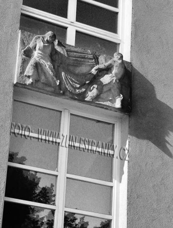 Arch. T.Slezák. Cihlový objekt s prodejnami a úřadovnou pošty 5. Jak bývalo v Gottwaldově a Otrokovicích přelomu čtyřicátých a padesátých let zvykem, vchody činžovních objektů zdobila domovní znamení.