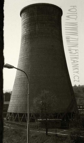 Rotační hyperboloid, autor neznámý. Jediná ze tří věží, jež nahradily původní nerentabilní dřevěná kondensační zařízení, která přežila do dnešního dne. Foto negativu z dubna 1988.