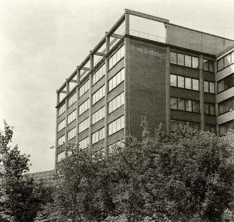 Budova z r. 1932. Přístavba severního traktu do výšky budovy s přiznáním železobetonového skeletu - kruhové sloupy. Autor F. Palacký (?). Foto negativu 6x6 z července 1992.