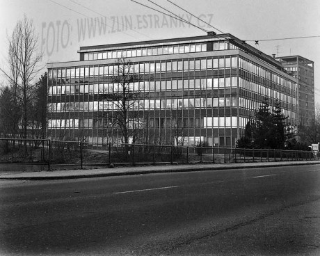 Akad.arch. Z.Plesník, spoluaut. K.Krčmář, I.Přikryl, O.Šlesinger. Původně šestipodlažní budova 72 x 72 m, modulová síť 6 x 6 m, ocelové sloupy, zvedané stropy. Střešní nástavba přibyla dodatečně. Foto negativu z 27. prosince 1989.