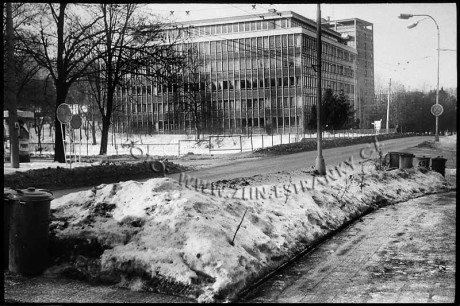 Akad.arch. Z.Plesník, spoluaut. K.Krčmář, I.Přikryl, O.Šlesinger. Původně šestipodlažní budova 72 x 72 m, modulová síť 6 x 6 m, ocelové sloupy, zvedané stropy. Střešní nástavba přibyla dodatečně. Foto negativu z února 1987.