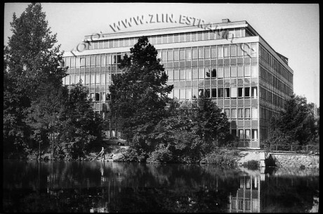 Akad.arch. Z.Plesník, spoluaut. K.Krčmář, I.Přikryl, O.Šlesinger. Původně šestipodlažní budova 72 x 72 m, modulová síť 6 x 6 m, ocelové sloupy, zvedané stropy. Střešní nástavba přibyla dodatečně. Foto negativu ze srpna 1987.