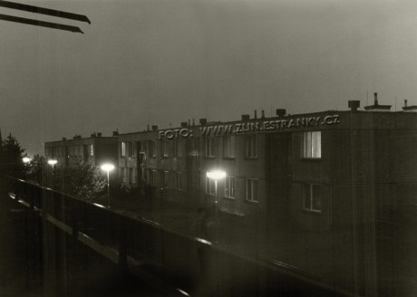 Arch. J.Gřegorčík a Š.Zelina (1968); spolupráce V.Vyhňák, A.Adamík, F.Dohnal. Chodník (vlastně střecha garáží) nese název zaniklé ulice, vedoucí za zobrazenými bloky domů. Javory tam přežily. Středoformátové foto 20. dubna 1991.