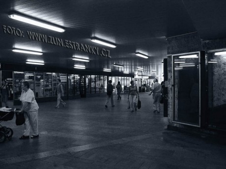 Arch. L. Pastrnek. Funkce západní stěny podzemí výrazně ožila po převratu v r. 1989. Podchod se ale také o přidané obchodní jednotky zúžil. Foto 17. června 2005.
