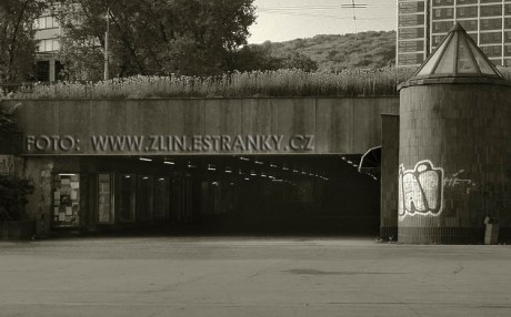 Arch. L. Pastrnek. Podchod v ranní hodině, čas kocovin a pospávajících bezdomovců. Věžička pochází z časů věžičkové idiocie počátku let devadesátých. Foto 26.VI.2006.