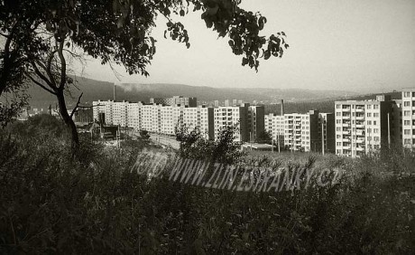Arch. D.Živocký a F.Balajka. Ve II. etapě realisovány deskové, bodové i řadové rodinné domy. Cihlený pásek nahrazen nátěry. Vysoká hustota obyvatelstva. Foto negativu ze srpna 1987.