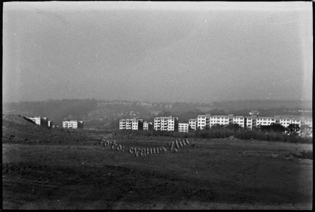 Arch. D.Živocký a Fr.Balajka (Stavoprojekt Gottwaldov). Horní etáže deskových domů z oblasti pozdější zástavby Na Honech II. a III. Foto negativu z října 1986.