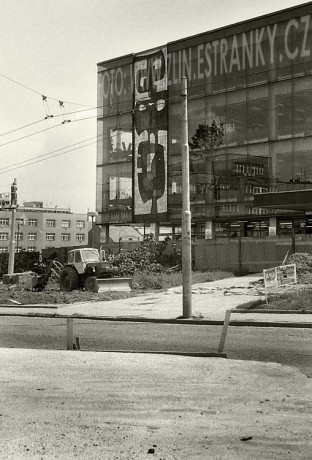 Proj.? Realizováno v létě 1985 JZD Slušovice jako tečka za výstavbou obchodního centra - Domů potravin, zeleniny a obuvi. Domy textilu a služeb nikdy nevznikly (měly stát na místě Zlatého jabka). Foto negativu z r. 1985.