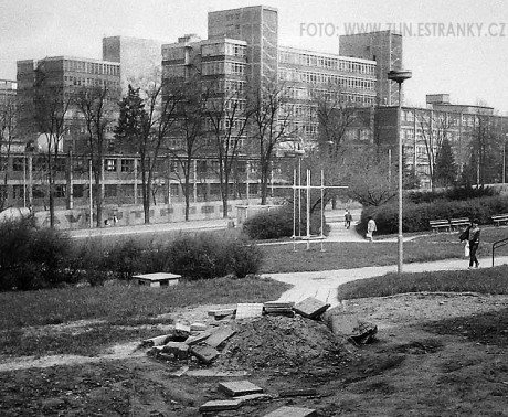 Obě arch I.Přikryl (Centroprojekt). B 32 (v popředí) - sklad obuvi o.p. Svit z r. 1985. B 33 (v pozadí) - sklad chemikálií n.p. Svit z r. 1972. A zeď? Správný tip - obuv Svit. Foto negativu z dubna 1987.