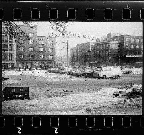 Křižovatka Revoluční, Muzinovy a Osvoboditelů. Zleva - v.d. Fotografia, Dílo, Dům obuvi, Dům zeleniny, Státní banka československá. Vlevo dole přívěsný vozík nějakého Pražáka. Foto negativu asi z února 1987 (i podle nápisu na dnešní K.B.)
