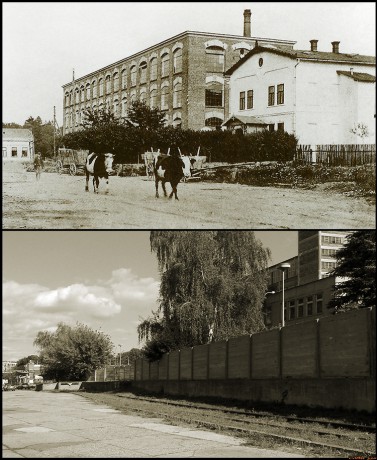 Nahoře: první tovární budova (vpravo) z roku 1900, za ní budova č. 16 z roku 1905 (zničena 20. listopadu 1944 při náletu), foto neznámý autor; Dole: prostor před zlínským nádražíčkem v září 2006, foto Cygnus, Sony Mavica.