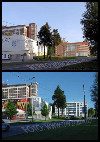 Nahoře: developerská lež - nové obytné budovy do červeného města - internetová grafika. Dole: Skutečnost z léta 2009. Nedoklonované zadrátování jsem provokativně napodobil a ponechal logicky barvu.