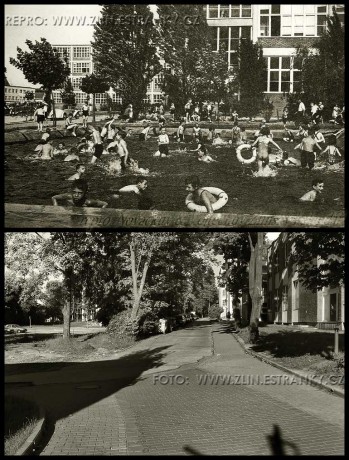Nahoře: koupaliště ve školní čtvrti (mezi Masarykovou a živnostenskou školou), OA Klečůvka, autor neznámý. Dole: 5. červen 2010, správná pozice k expozici je cca 5 až 10 metrů na jih, ale tam dnešní fotograf stojí proti zdi přístavby SPŠ stavební.