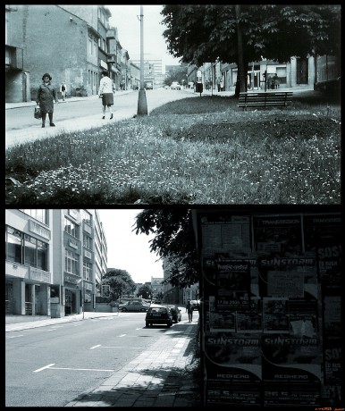 Nahoře: červen 1977, foto Cygnus, Smena 8M; Dole: květen 2006, foto Cygnus, Sony Mavica; spodní snímek je z nevhodného úhlu zabrán - bývalý parčík obebíná třináctiletá stavební ohrada, za ní se rozvaluje stejně staré rumiště