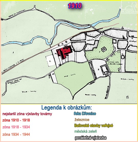 To už ale v roce 1899 proťala jižní část této údolní roviny nová železniční trať z Otrokovic do Vizovic. A v roce 1906 zde firma T. & A. Baťa postavila vícepatrovou zděnou tovární budovu u hlavní brány naproti nádraží. Stavba dostala později číslo 16. V její blízkosti pracovala dřevěná továrnička na obuv Morice Lehra a když v srpnu 1909 vyhořela, převzala ji firma Baťa. Stávala tu někde i garáž pro první tovární auto, které zakoupil v roce 1908 Tomáš Baťa. Jeho šoférem byl tehdy strojnický učeň Jan Hoza, pozdější John Hoza , ředitel Baťových továren v Belcampu.